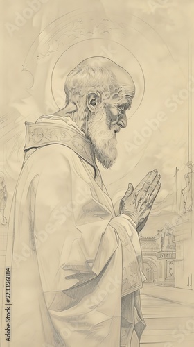 © T Studio, Fototapeta premium Illustration of Prayer of St. Leo the Great in 5th-Century Church, Biblical Illustration, Beige Background, Copyspace
