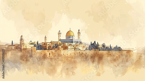 Obraz premium Illustration of Psalms 122 depicting the Lord's house in Jerusalem, with a beige background and copy space for spiritual or religious purposes.