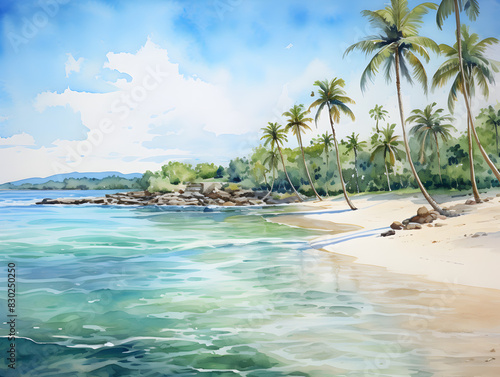 Obraz premium Illustration of ranquil beach scenes with white sand, clear blue water and...