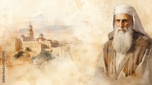 © T Studio, Obraz premium Illustration of Reflection of St. Cyril of Jerusalem in Ancient Jerusalem, Biblical Illustration, Beige Background, Copyspace,Christian banner