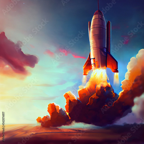 Obraz premium Illustration of rocket and copy space for start up business. Creativity and imagination.