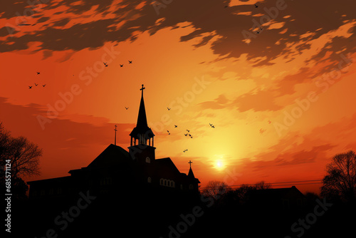 © agrus_aiart, Obraz premium illustration of silhouette of church at sunset. Created with Generative AI