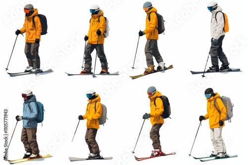© larisikstefania, Obraz premium illustration of silhouettes of skiers in various equipment on a white background