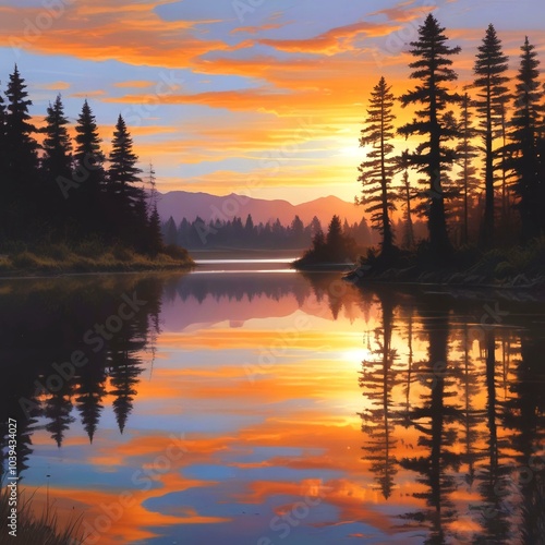 © BetiBup33, Fototapeta premium Illustration of sunrise with light reflection on ocean surface.