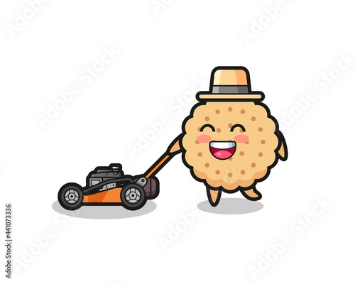 Fototapeta premium illustration of the round biscuits character using lawn mower