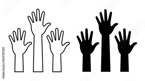 Obraz premium Illustration of three hands raised in outline and three hands raised in solid black color style