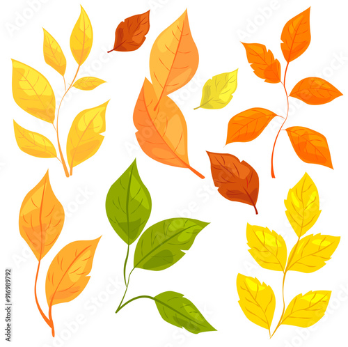 © Lena_Fotostocker, Obraz premium Illustration of various colorful autumn and spring leaves on a white background. Concept of seasonal changes and nature. Vector illustration