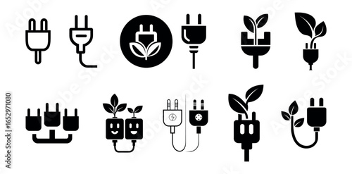 Fototapeta premium Illustration of various electrical plugs and connectors with plant and leaf...