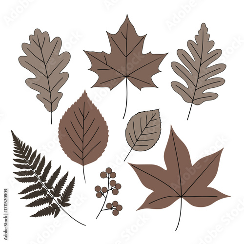Fototapeta premium Illustration of various leaves and berries in neutral brown tones on a white...