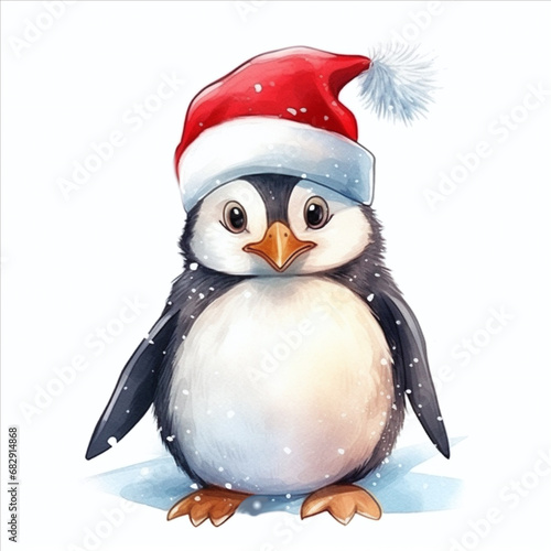 Naklejka premium Illustration of Watercolor christmas penguin in white background. Christmas animal. Cute baby Pinguin with christmas hat. Print, card, poster