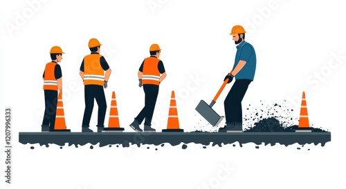 © Georgii, Naklejka premium Illustration of workers in safety vests paving road with construction cones and a shovel