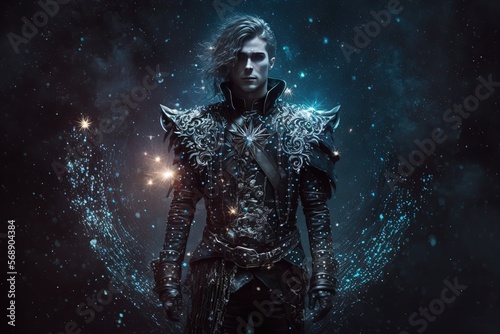 © QuietWord, Fototapeta premium illustration rock star portrait, a man in handsome gothic leather black jacket with glitter glow festive background, Generative Ai