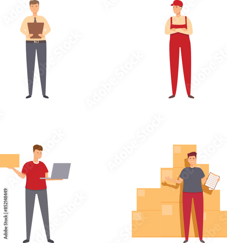 Obraz premium Illustration set showing delivery men with packages, a checklist, and a laptop