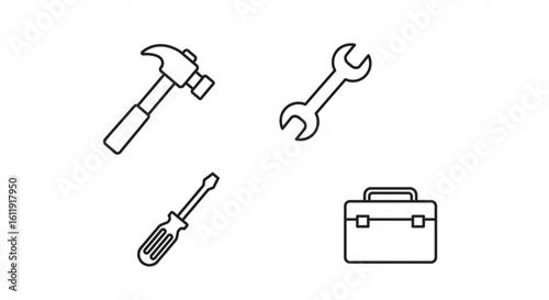 Fototapeta premium Illustration showing a hammer, a wrench, a screwdriver and a toolbox in a simple line drawing style