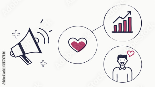 © Hamza, Obraz premium Illustration showing a megaphone, heart, graph, and a smiling man with a heart above his head