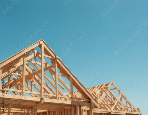 © miss irine, Obraz premium Illustration shows unfinished house framing with wood trusses and beams. Construction project against clear blue sky. Visible structural framework detail signifies craftsmanship and building process.