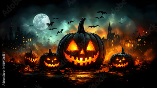 Fototapeta premium Illustration Spooky Halloween Night Pumpkins Bats Castle Moon Background