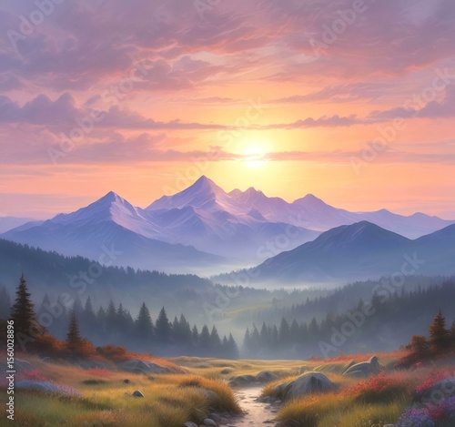 © BetiBup33, Obraz premium Illustration sunrise landscape in pastel colors.