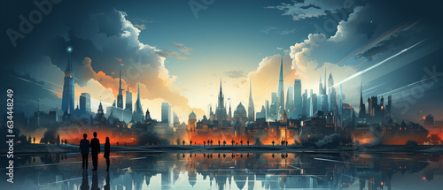 Fototapeta premium illustration teamwork of A group of people stand in front of a cityscape