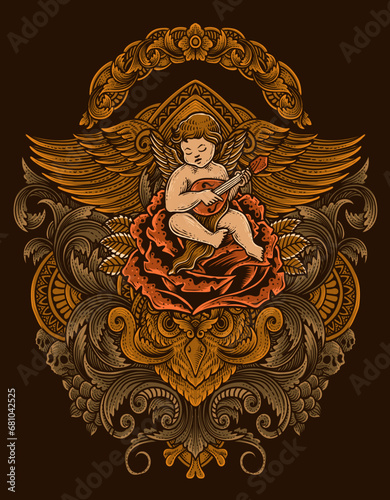Obraz premium Illustration vector cupid angel playing guitar sitting on rose with engraving ornament