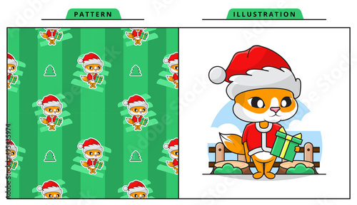 Fototapeta premium Illustration Vector Graphic of Cute Cat Wearing Santa Claus Costume with Decorative Seamless Pattern