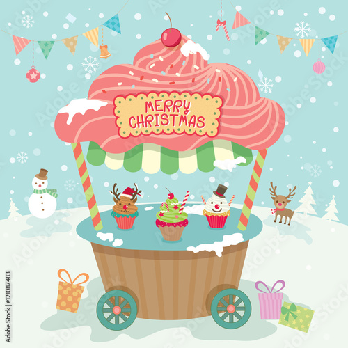 Fototapeta premium Illustration vector of merry christmas cupcake push cart booth kiosk with...