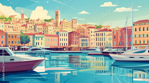 Fototapeta premium Illustration, view on marseille harbor in France, touristic advertisement...