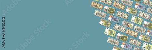© GAlexS, Fototapeta premium Illustration. Wide banner with empty space left and right different banknotes of the world with shadows. US, EU and Swiss bills. Dollars, francs and euro.