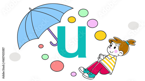 Naklejka premium Illustration with a girl, letter u, umbrella, and colorful circles forming a playful composition