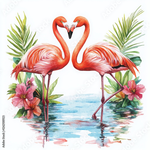 © Sukifli Dakheng, Fototapeta premium Illustration with flamingos forming heart feels romantic