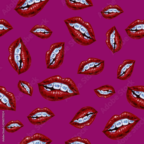 Fototapeta premium Illustration with lips and braces. Seamless pattern on a vinous background.