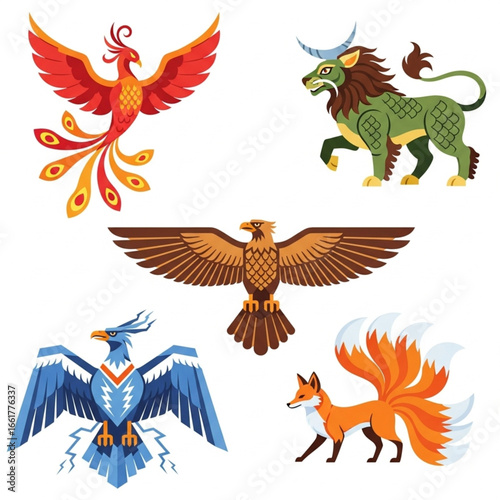 Obraz premium Illustrations of mythical creatures including a phoenix, eagle, qilin, and...