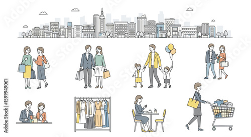 Obraz premium Illustrations of people engaged in various everyday activities including shopping and leisure in an urban setting