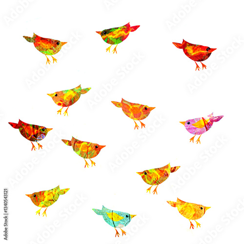 © Monika, Fototapeta premium Ilustracja stado kolorowych ptaszków ptaki w różnych wersjach kolorystycznych białe tło