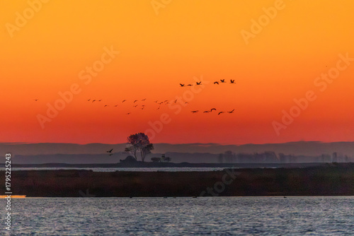 © Karl, Fototapeta premium Im Morgenrot fliegende Kraniche am Bodden vor Zingst.
