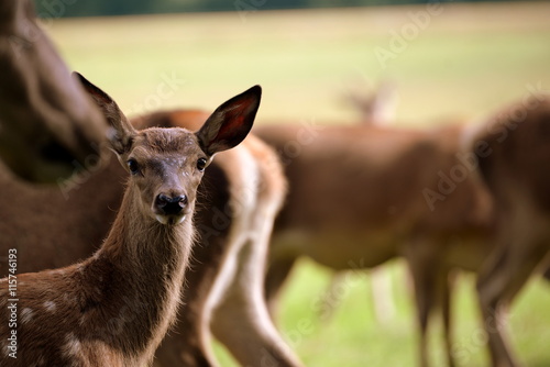 © Grubärin, Fototapeta premium im Schutze der Herde, Rotwildkalb zwischen weiblichen Tieren