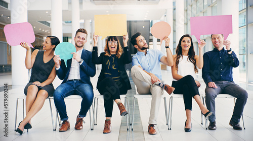 © Arcurs Co-op/peopleimages.com, Naklejka premium Im the ideal candidate because...Shot of a group of businesspeople holding colorful speech bubbles while waiting in line in a modern office.