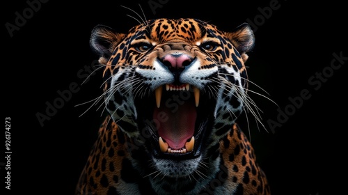 Naklejka premium Image captures a jaguar mid-roar, showcasing its powerful jaws and sharp fangs, symbolizing raw power and the wild, untamed nature of big cats in their natural habitat, commanding presence.