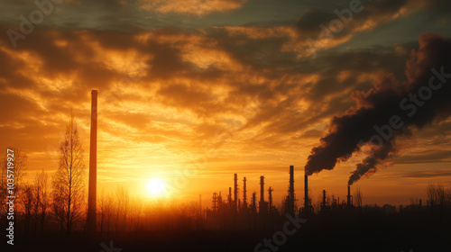 © kongkiat chairat, Naklejka premium image captures dramatic sunset over industrial landscape, highlighting smokestacks and pollution. scene evokes sense of environmental concern and impact of industry on nature