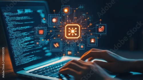 Naklejka premium image depicts person typing on laptop with digital icons representing technology and data surrounding screen, conveying sense of innovation and connectivity.