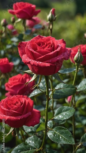 © Tamazina, Obraz premium Image displays close-up of vibrant red roses with dewdrops on their petals, set against blurred background of green foliage. Foreground shows several blooming roses, buds at various stages of opening.