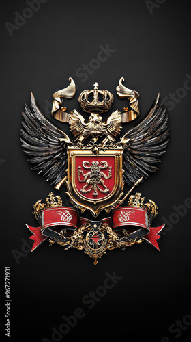 © Kitta Studio, Obraz premium image features detailed and ornate family crest, showcasing symbols of power and nobility. design includes lion, wings, and crowns, all set against dark background, evoking sense of grandeur and heri