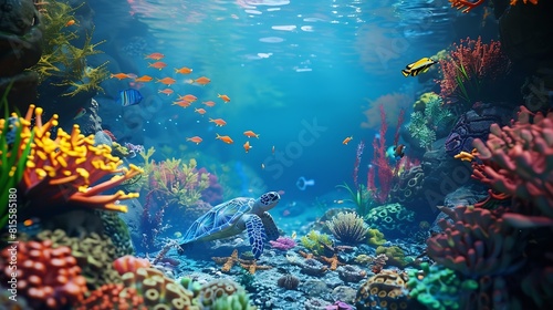 Fototapeta premium Image for 3d floor Underwater world Turtle corals : Generative AI