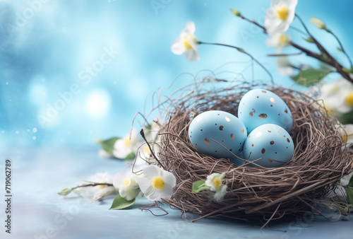 © Estefania, Obraz premium Image of a basket with easter eggs blue and golden and daffodil flowers