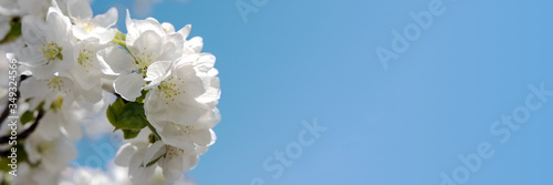 © Sergey, Fototapeta premium Image of a blooming flower of apple tree. Blue sky background. Banner. Place for text. Copy space