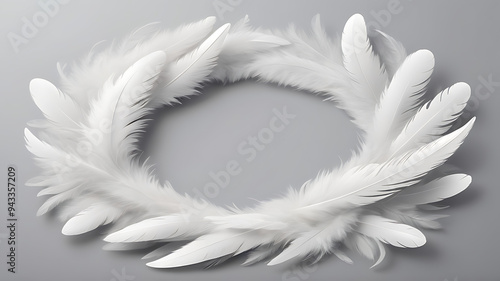 © Riteek, Obraz premium image of a bunch of soft fluffy white feathers arranged in a circular pattern on an isolated plain light gray background.