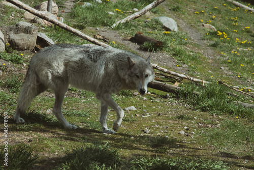 Fototapeta premium Image of a grey wolf walking in the shade. In the grizzle and wolf rescue center.