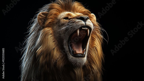 © kept, Naklejka premium Image of a roaring lion with dramatic lighting highlighting its powerful features, sharp teeth, and majestic mane.