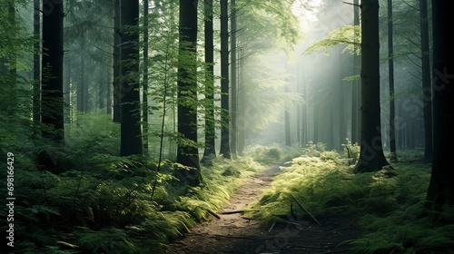 © MdTaher, Naklejka premium Image of a serene green forest tranquil, Generative ai.