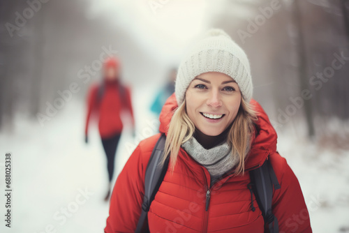 Obraz premium Image of a woman in the winter with sportswear, with winter landscape bokeh in the background, with empty copy space